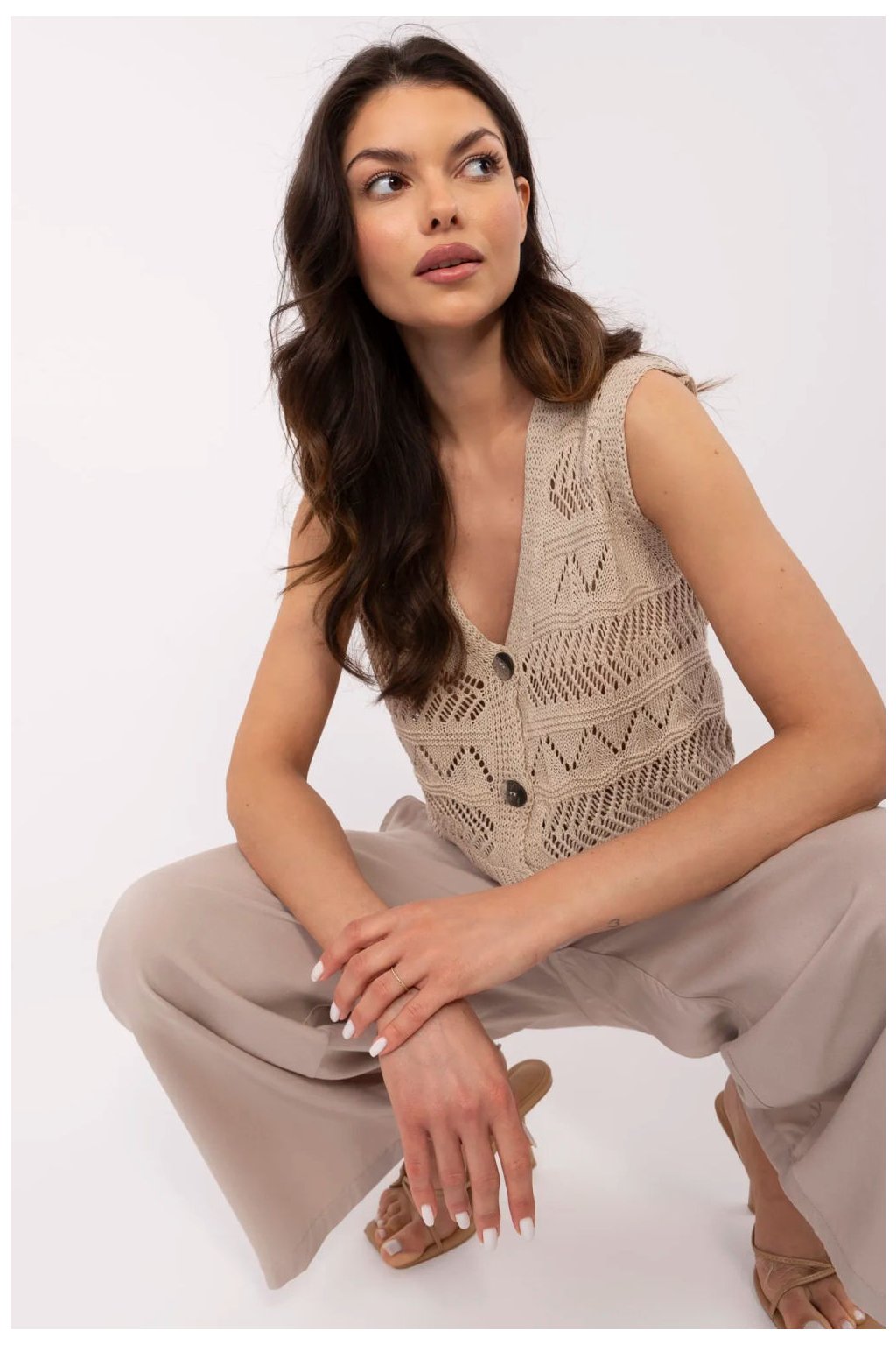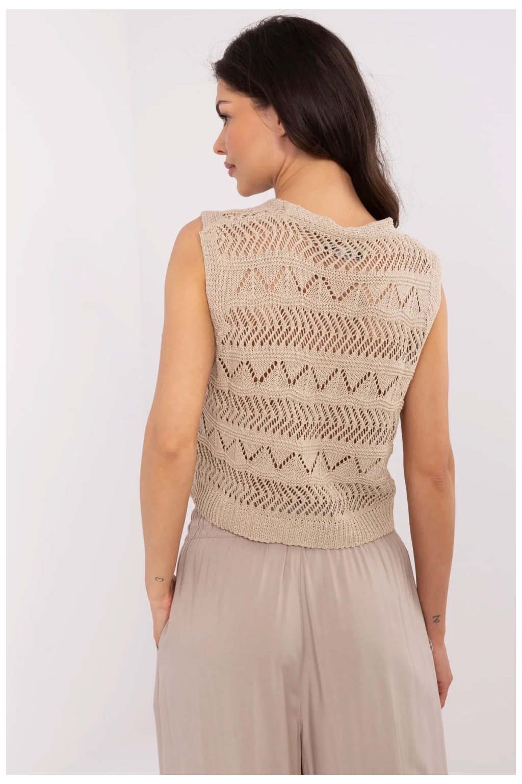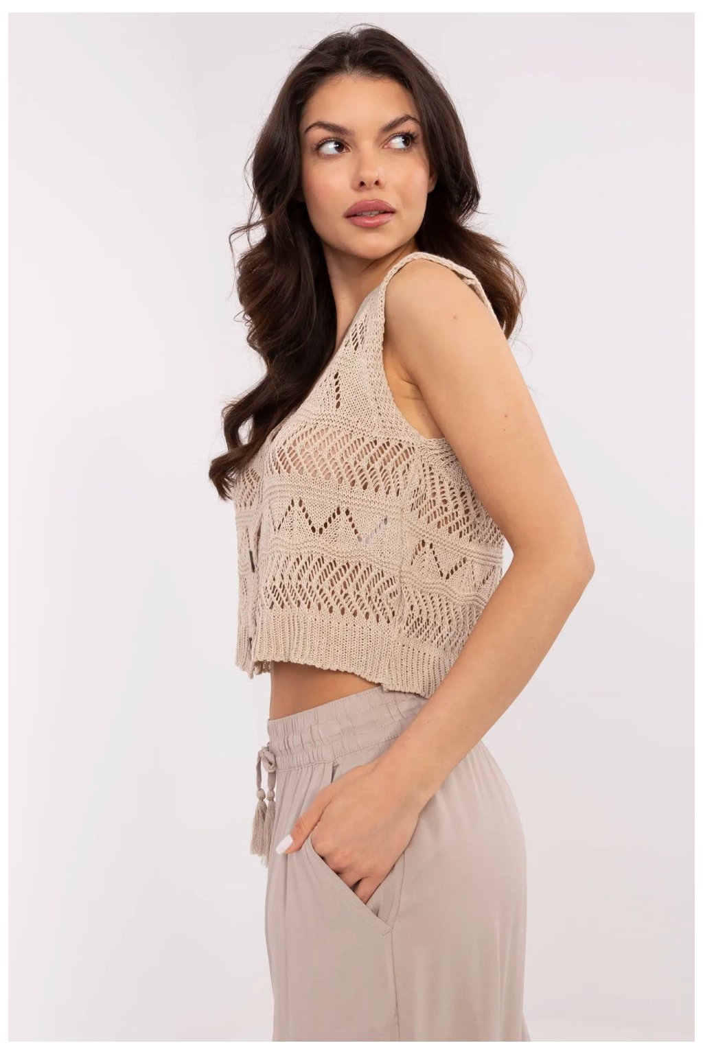 Průsvitný dámský vestička v casual stylu je módním a lehkým doplňkem pro každodenní stylizace. Vyrobený z směsi bavlny a polyakrylu, je příjemný na dotek, vzdušný a pohodlný při nošení. Model bez rukávů, s krátkou délkou a výstřihem do V, skvěle ladí jak s košilí, tak s jednoduchým tričkem. Průsvitný vzor dodává celku jemnost a lehkost, a klasické zapínání na knoflíky zdůrazňuje uvolněný, každodenní charakter vesty. Jedná se o univerzální návrh, který skvěle poslouží po celý rok jako doplněk mnoha stylizací.