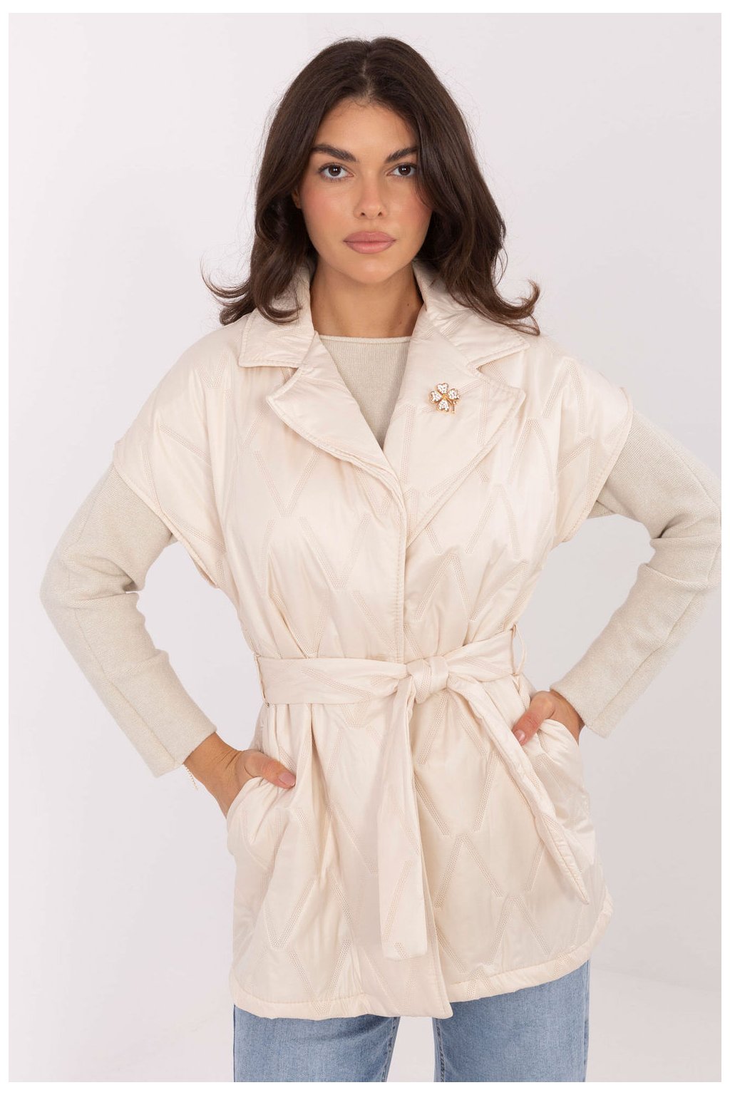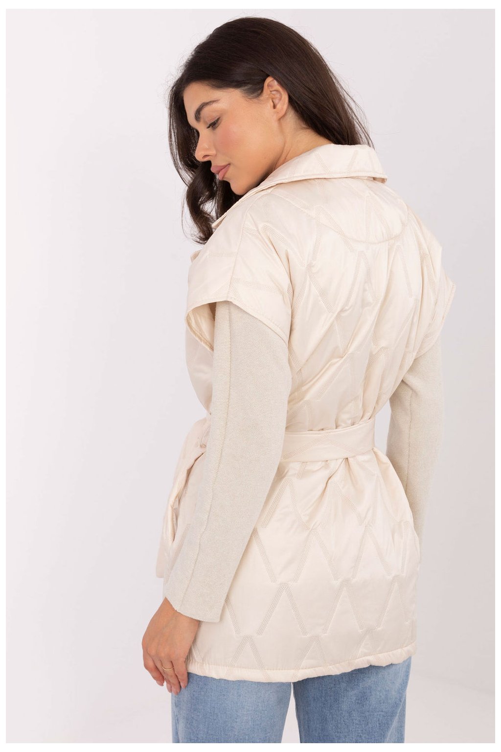 Elegantní dámská vesta se standartní délkou, zapínání na knoflík a vybavená klasickými límci. Vyrobená z polyesteru s syntetickým plněním, je lehká a pohodlná na nošení, zároveň praktická v přechodném období ideální na podzim, zimu a jaro. Model vyniká roztomilým šitím a různorodou texturou materiálu, co mu dodává výjimečný charakter. V pasu je šňůrka k zavázání, která krásně zdůrazňuje postavu. Vložené kapsy přidávají funkcionalitu a brož na límci je elegantní, decentní akcent. Je to ideální volba na každý den a do práce, spojuje pohodlí, ženskou eleganci a nadčasový styl, vytvářející univerzální kus šatníku.