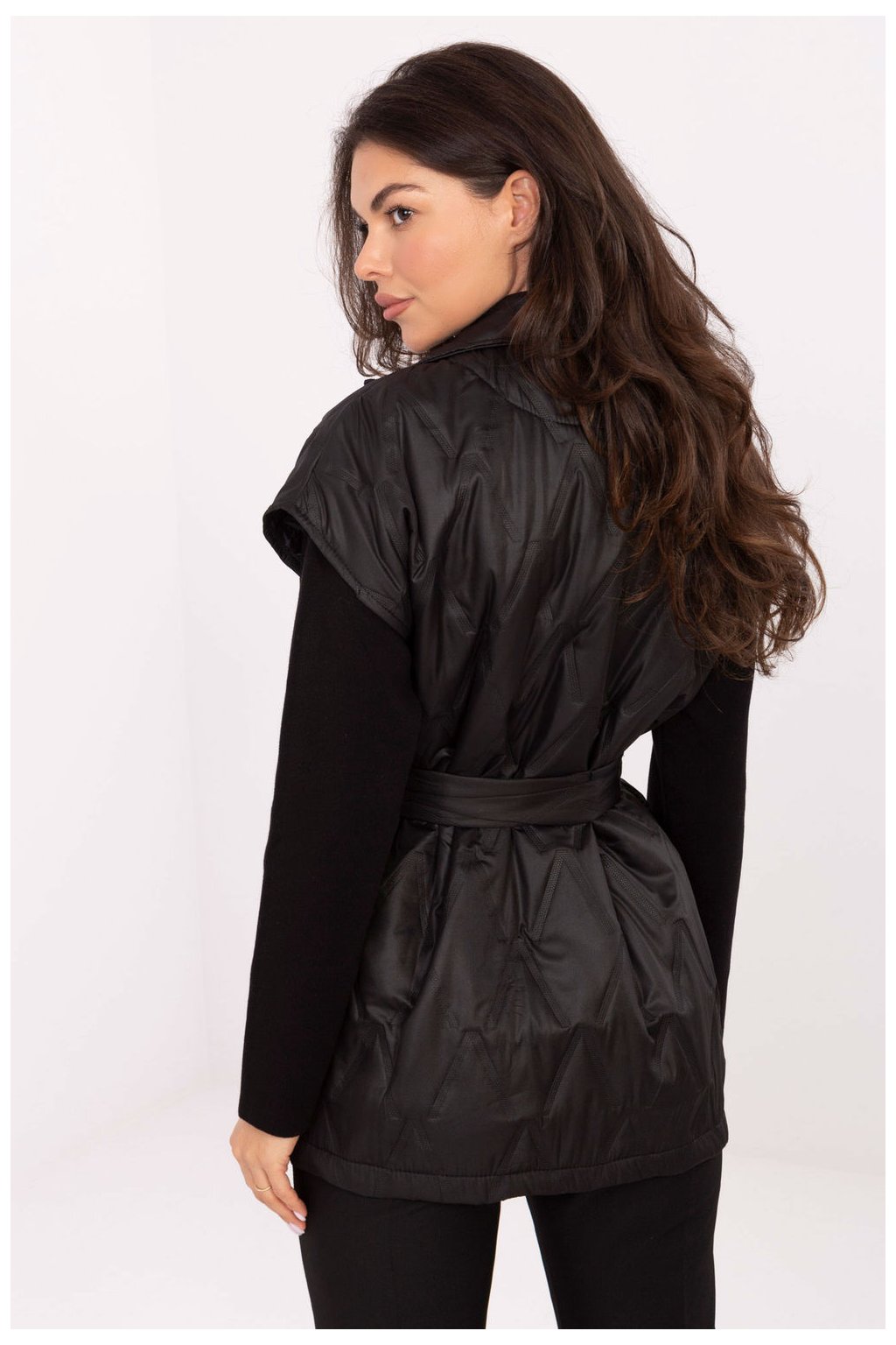 Elegantní dámský piké vesta standardní délky s knoflíkem a klasickými límci. Vyroben z polyesteru s syntetickým plněním, je lehký a pohodlný na nošení, zároveň praktický v přechodném období ideální na podzim, zimu a jaro. Model se vyznačuje roztomilým pikováním a různorodou strukturou materiálu, co mu dodává výjimečný charakter. V pasu je pásek k zavázání, který krásně zdůrazňuje postavu. Vsuvné kapsy přidávají funkčnost a brož na límci je elegantním, decentním akcentem. Ideální volba na každý den a do práce, spojuje pohodlí, ženskou eleganci a nadčasový styl, vytvářející univerzální kus šatníku.