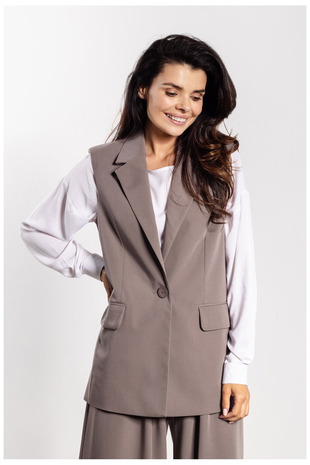 Elegantní vesta s jednoduchým, klasickým střihem je nadčasovým prvkem šatníku. Jednořadé zapínání na knoflík a límce u dekoltu zdůrazňují elegantní charakter, zatímco lehce prodloužená linie zeštíhlí postavu. Praktické kapsy s límečkem dodávají moderní akcent a univerzální střih umožňuje kombinovat vestu jak s kalhotami, cigaretovými kalhotami, tak i s sukní. Ideální pro firemní a neformální outfit.