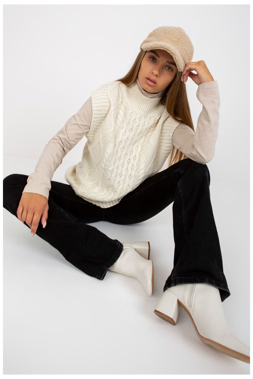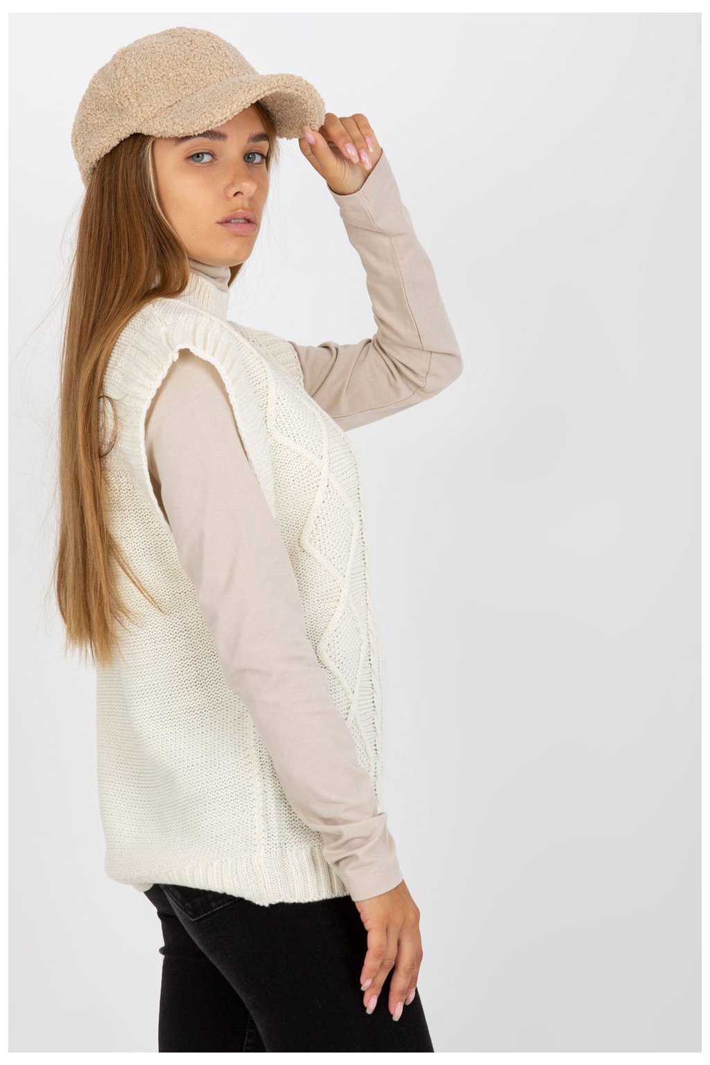 Pletená bunda bez rukávů se zajímavou kostkovanou vazbou. Ideální pro mnoho příležitostí.